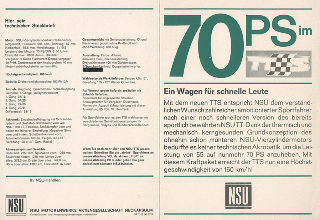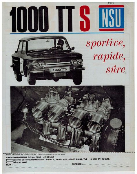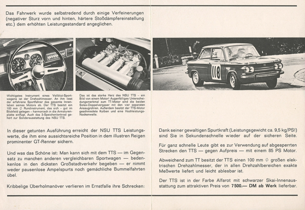 Von NSU als Motorsport Basismodell angebotene Tourenwagen war auf Augenhöhe mit Konkurenten wie Abarth 1000 oder Simca Rally,Bei Bergrennen dominierte er die 1000er Klasse. Zuerst als Prinz 1000 TTS,später NSU TTS in mehreren Blocks gefertigt von 1967-1971.Es wurden nur 2402 Stück gefertigt.